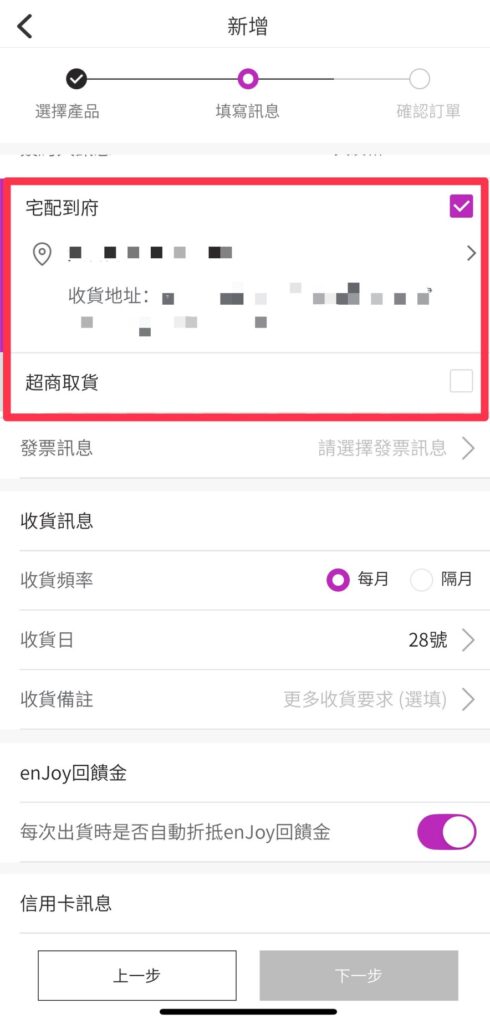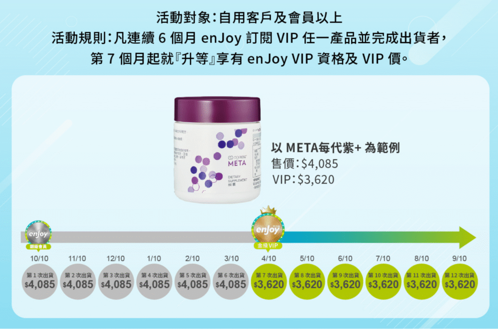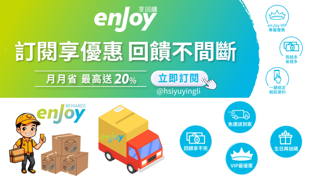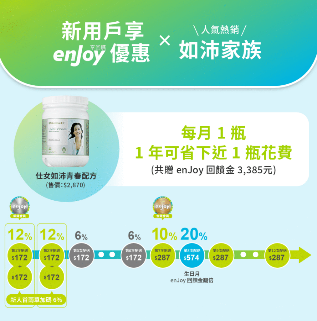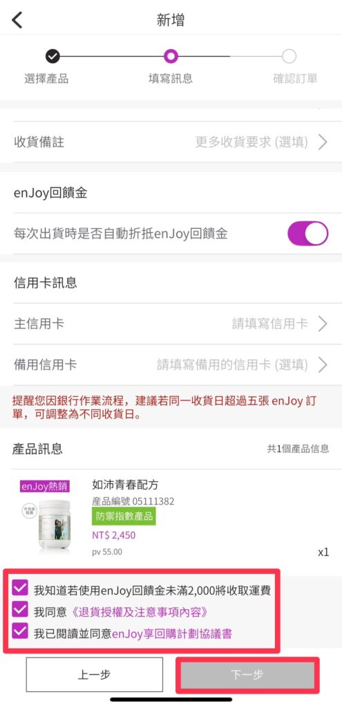 內容目錄 Toggle 前言《 enJoy 享回購計畫》三大優勢⓵滿2000元就免運費⓶彈性出貨頻率,無須每月出貨⓷回饋金超有感enJoy 享回購升級 VIP 計畫如何建立enjoy訂單?一步步教你快速設定~第一步 開啟新享購APP⓵有會員帳號,直接登入即可購買商品⓶沒有會員帳號可以先【免費加入會員】,就可以開始購買囉第二步 點選enJoy享回購第三步 點選新增第四步 選擇商品第五步 填寫資訊 前言 一步步帶你搞懂《 enJoy 享回購計畫》每次買 Nu Skin 湊滿4000免運是不是讓人崩潰?我以前18歲開始使用也是這樣,湊商品湊到頭暈,差一點點就卡住…身為15年以上的愛用者~不藏私推薦給愛 Nu Skin 的你~真的省時省力又省錢有每月回購的朋友更一定要用!一次設定好,每次出貨都放心又享受~有夠 enJOY! 《 enJoy 享回購計畫》三大優勢 ⓵滿2000元就免運費 不用再苦苦湊到 4000 元才能免運,輕鬆下單更省荷包。 ⓶彈性出貨頻率,無須每月出貨 可選擇每月或每兩個月出貨一次,依照自己的使用習慣調整,不怕囤貨。 ⓷回饋金超有感 新客戶才有的優惠,前兩次出貨享有 12% 回饋金,第7次10%,生日月還有額外 10% 回饋。 enJoy 享回購升級 VIP 計畫 VIP 升級制度,自 2024/09/01起正式上線連續 6 個月 enJoy 訂閱 VIP 任一產品並完成出貨者,第 7 個月起就『升等』享有 enJoy VIP 資格及 VIP 價。 只要獲得 VIP 資格,即可自由選擇搭配人氣熱銷商品 月月 enJoy 享回購成功出貨任一 VIP 商品,享有市場最優惠的價格 (如沛家族無 VIP 優惠價) 自用客戶也可以加入,簡單訂貨、輕鬆享優惠 enJoy商品專區 如何建立enjoy訂單?一步步教你快速設定~ IOS版本Android版本 第一步 開啟新享購APP 登入會員帳號~點選我的 ⓵有會員帳號,直接登入即可購買商品 ⓶沒有會員帳號可以先【免費加入會員】,就可以開始購買囉 【透過連結加入,專屬服務】 如何加入繼續往下觀看文章~ 第二步 點選enJoy享回購 第三步 點選新增 第四步 選擇商品 對於想要購買的產品可以搜尋後,右邊按「 + 」號加入購物車後,往下按下一步 第五步 填寫資訊 填寫收貨人的姓名、電話、地址、email 宅配或超商取貨等等…※記得收貨人的姓名、電話、收貨地址、收貨日有變動,要在原訂的收貨日,要在原訂的收貨日「前 5 天」進行更改,否則是不能更動的喔!每月或是隔月出貨、收貨日期選擇 5 – 28 日找一天當作收貨日期、回饋金折抵 閱讀完 相關注意事項及計畫同意書點選進去閱讀完後,打上勾勾,點選下一步就完成享回購訂單囉了 新品快訊、科學知識通通先知道!加入我們,獲取第一手消息~📲✨或是如新保養、保健品問題想問嗎?歡迎加入~北醫代謝健康管理師 幫你量身訂製屬於你的保養保健品。 北醫代謝健康管理師幫你守護你的健康